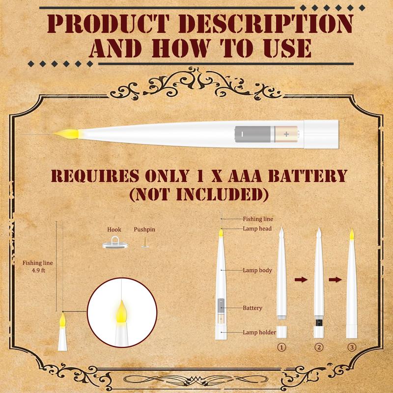 Magical Floating LED Candles with Remote Wand – Create a Holiday Wonderland Bring the magic of the season into your home with this flameless LED taper candles. Designed to float with nearly invisible fishing line, these candles create a stunning illusion,perfect for Christmas, Halloween, parties, weddings, and festive indoor or outdoor decor.